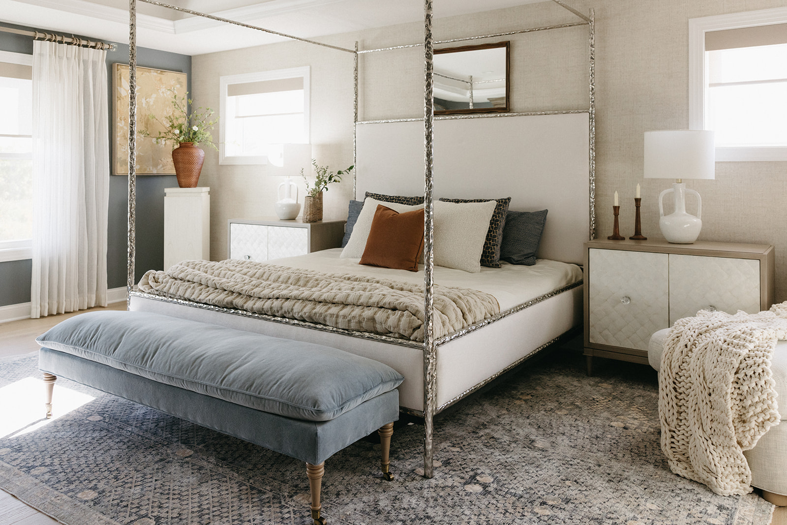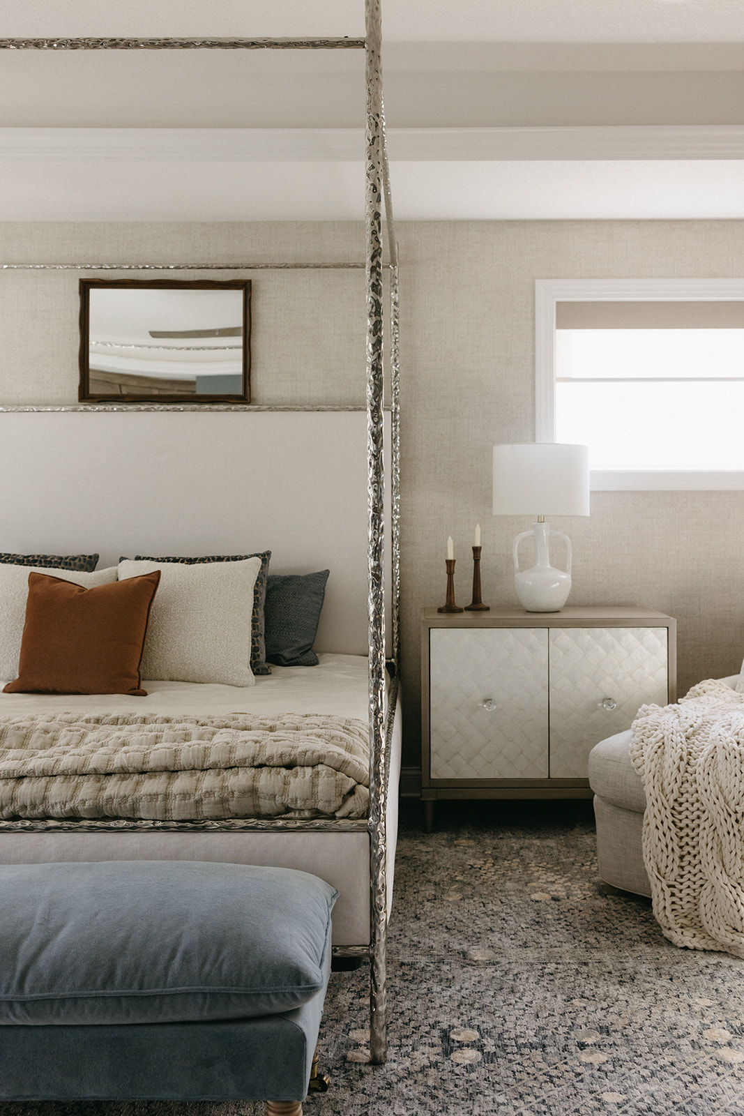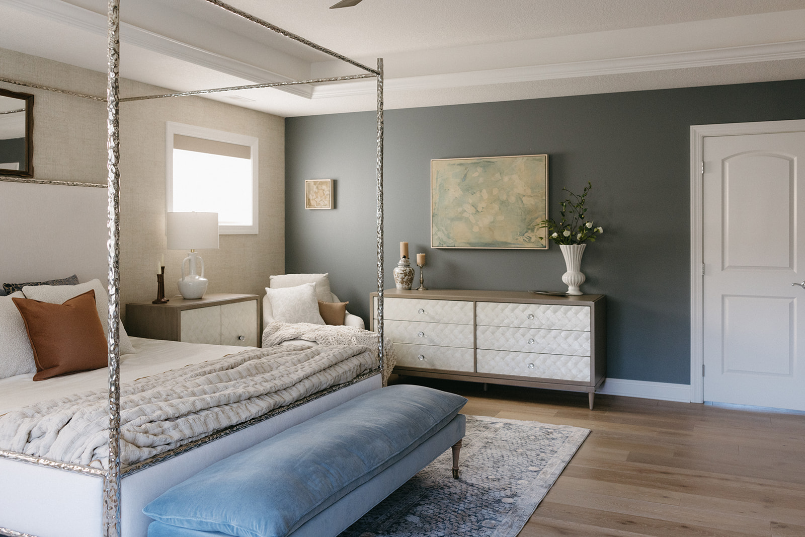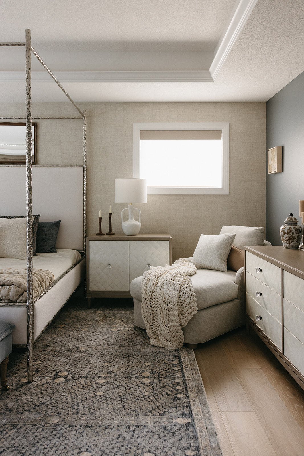 This remodel and furnishings project transformed this bedroom into the prettiest, softest sanctuary imaginable. Filled with gentle tones, layered textures, and thoughtful statement pieces, the space feels like a breath of fresh air. Every detail was curated to create a serene, elevated atmosphere, light, airy fabrics, warm natural materials, and artful accents that bring both comfort and character. The result is a soothing retreat that blends modern elegance with effortless coziness, making the room as inviting as it is beautiful.